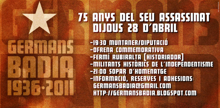 DIJOUS 28 D’ABRIL varen tenir lloc els actes d’homenatge als Germans Badia en el 75è aniversari del seu assassinat, organitzats per l’Associació Germans Badia amb l’adhesió de l’Associació Patriòtica Catalunya 1640, de la Fundació IRLA, de les Joventuts d’Esquerra Republicana de Catalunya, de les Joventuts Unitat Nacional Catalana (Nosaltres Sols) i Palestra.
